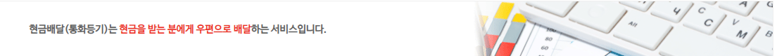 현금배달(통화등기)는 현금을 받는 분에게 우편으로 배달하는 서비스입니다.