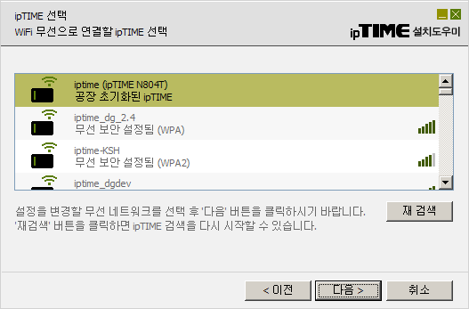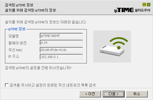 "공장 초기화 된 ipTIME" 이라는 설명과 함께 설치할 공유기가 자동으로 선택됩니다.