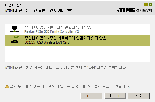 (만약 무선랜 어뎁터가 보이지 않는 경우, 유선랜 어뎁터를 선택하신 후 설치도우미 설명에 따라 진행합니다.)