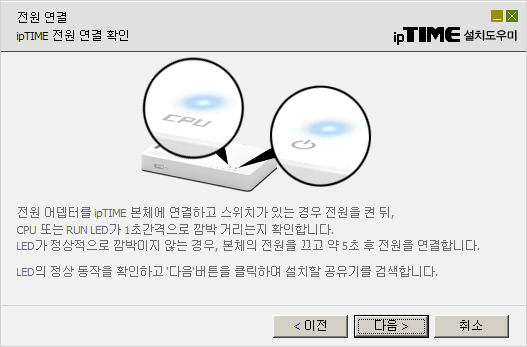 설명에 따라 공유기에 전원을 연결하고 동작 램프를 확인한 후 [다음]을 클릭합니다.