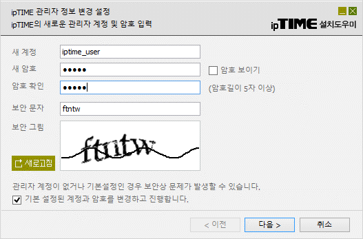 설정합니다. 설정을 원치 않는 경우, 페이지 하단에 위치한 [기본 설정된 계정과 암호를 변경하고 진행합니다] 항목을