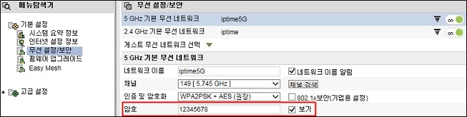 1단계 ‘공유기 웹 설정화면 접속 및 로그인’이 완료되었다면 공유기의 무선 암호 설정 여부를 확인합니다.