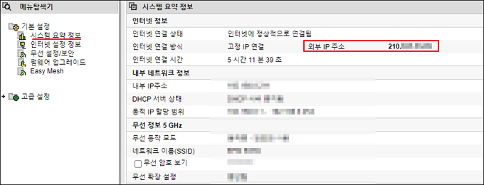 (1) 기본 설정-> 시스템요약정보에서 [외부 IP 주소]를 확인합니다.