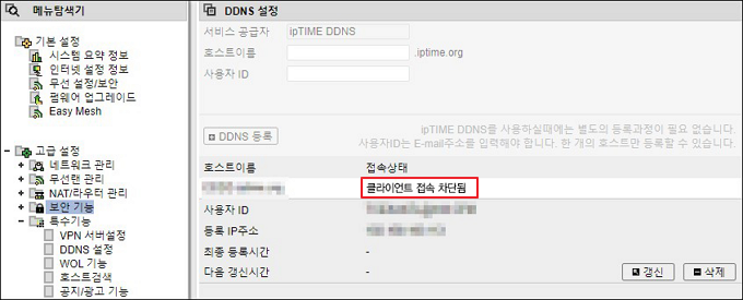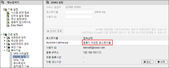 갱신, 삭제 등으로 ipTIME DDNS서버에 과도한 트래픽을 유발하였다고 판단될 경우 등록을 차단합니다.
