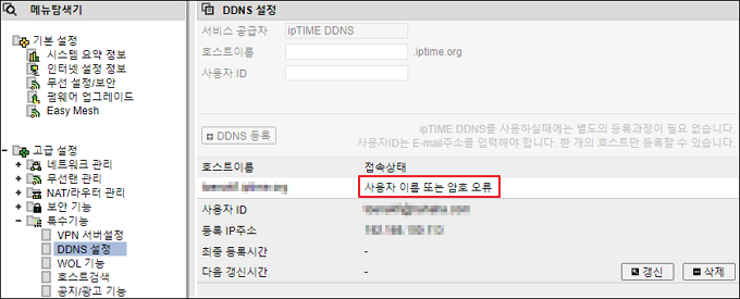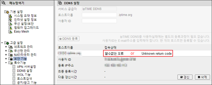 DDNS를 등록하면 접속 상태를 확인할 수 있는데 이때, 정상 등록이 이루어지지 않은 경우 오류메세지가 표기됩니다.