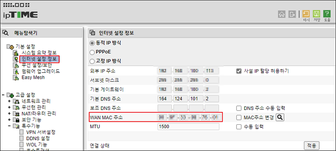 공유기의 WAN MAC주소는 공유기 관리 화면의 [기본 설정]-> [인터넷 설정 정보]에서 확인할 수 있습니다.