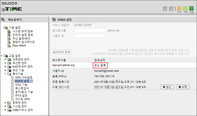 아래와 같이 접속 상태에 ‘정상등록’으로 표기되면 DDNS 등록이 정상적으로 완료된 것으로 DDNS서비스를 이용할 수 있습니다.