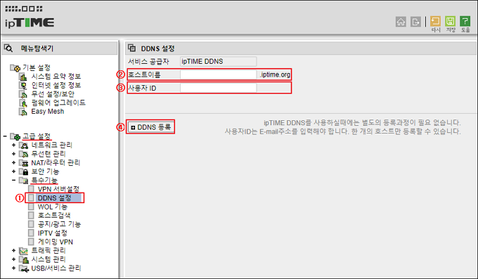 메뉴탐색기의 [고급 설정]의 [특수기능] 메뉴로 접속하여 아래 그림의 ① ~ ④ 순서로 DDNS설정을 진행합니다.