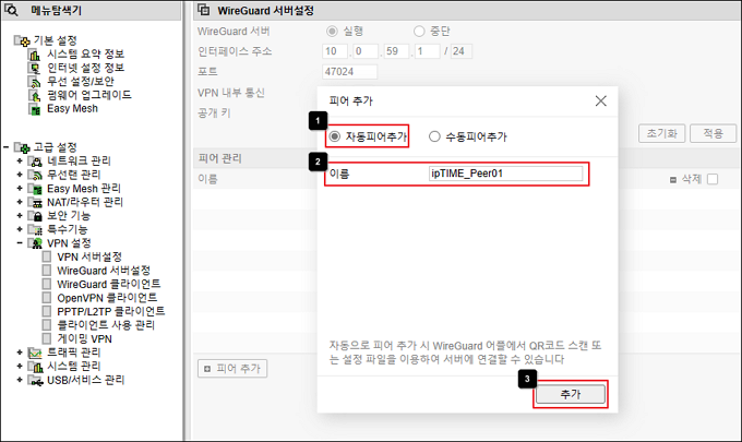 ipTIME WireGuard VPN서버 설정에서 피어 추가는 자동과 수동, 두가지 방식으로 추가할 수 있습니다.