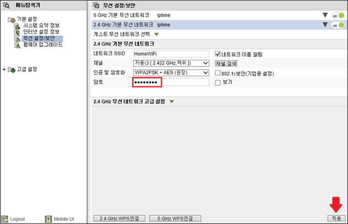5) 네트워크 암호, 네트워크 키에 비밀번호 8자리 이상을 입력하고 적용을 클릭합니다.