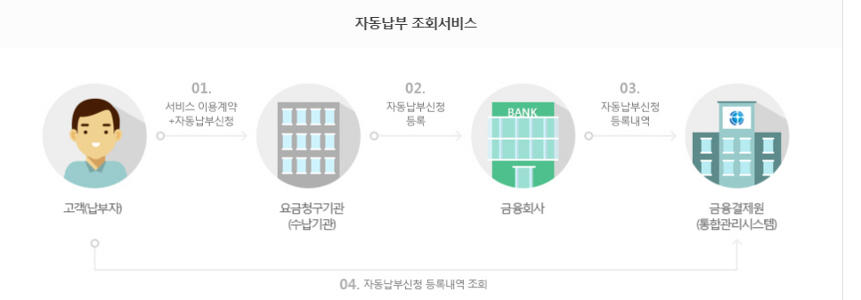 금융회사 및 금융결제원에서는 자동이체의 상세정보(자동이체 수납대금의 용도 , 자동이체 기일 등)를 알 수 없습니다.