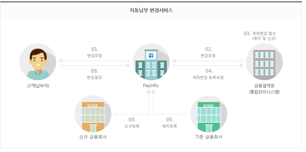 자동이체 변경서비스는 자동이체가 등록된 출금계좌를 변경할 수 있는 서비스로서 기존 금융회사에 등록된 자동이체 해지와 변경할 금융회사에 해당 자동이체 신규 등록으로 처리됩니다.
