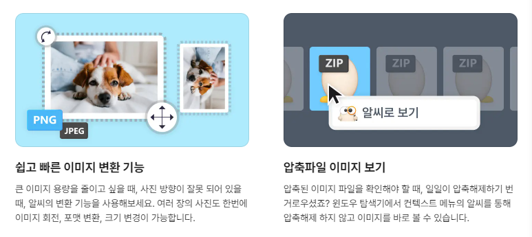 압축된 이미지 파일을 확인해야 할 때, 일일이 압축해제하기 번거로우셨죠? 윈도우 탐색기에서 컨텍스트 메뉴의 알씨를 통해 압축해제 하지 않고 이미지를 바로 볼 수 있습니다.