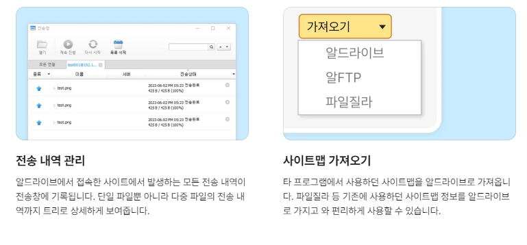 타 프로그램에서 사용하던 사이트맵을 알드라이브로 가져옵니다. 파일질라 등 기존에 사용하던 사이트맵 정보를 알드라이브로 가지고 와 편리하게 사용할 수 있습니다.