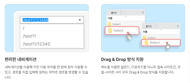 FTP, FTP over SSL/TLS, SFTP뿐만 아니라 새롭게 WebDAV 형식을 추가 지원합니다. 공개키, 개인키 인증 방식으로 더욱 안전하게 접속해 이용할 수 있습니다.
