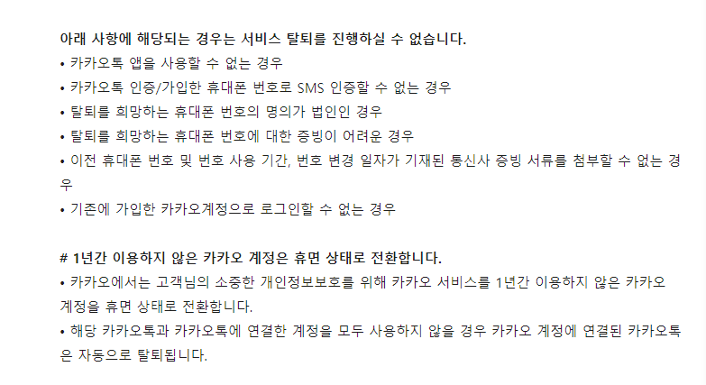• 카카오에서는 고객님의 소중한 개인정보보호를 위해 카카오 서비스를 1년간 이용하지 않은 카카오 계정을 휴면 상태로 전환합니다.