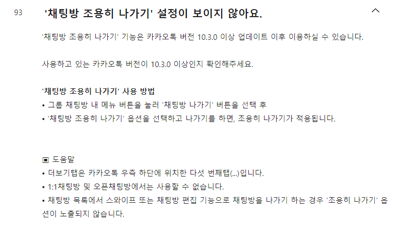 '채팅방 조용히 나가기' 기능은 카카오톡 버전 10.3.0 이상 업데이트 이후 이용하실 수 있습니다.