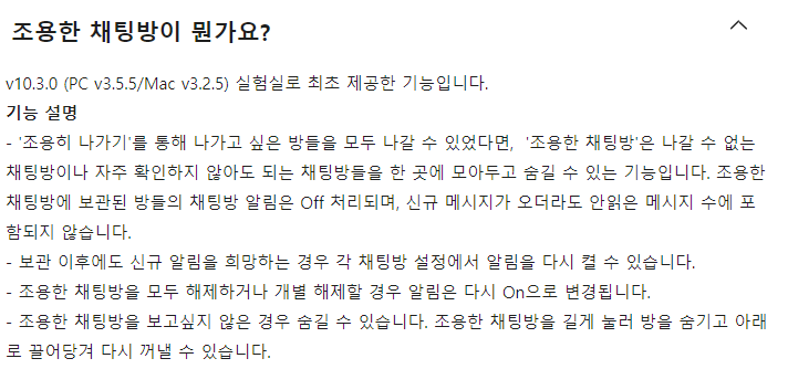 - "실험실 이용하기"를 비활성화 하거나 "조용한 채팅방" 기능을 비활성화 할 경우 조용한 채팅방은 모두 해제되고 다시 기능을 활성화 하더라도 이전 정보가 복구되지 않습니다.