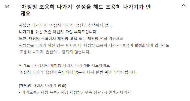 채팅방을 나가기 하신 경우 실험실 내 '채팅방 조용히 나가기' 설정이 활성화되어 있더라도