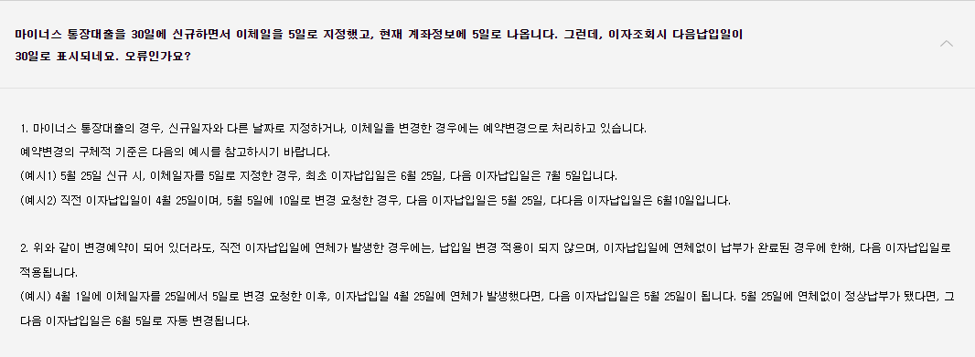 2. 위와 같이 변경예약이 되어 있더라도, 직전 이자납입일에 연체가 발생한 경우에는, 납입일 변경 적용이 되지 않으며, 이자납입일에 연체없이 납부가 완료된 경우에 한해, 다음 이자납입일로 적용됩니다.