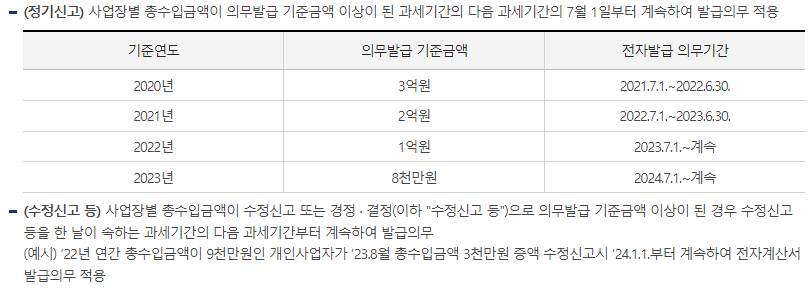 2019년 7월 1일에는 직전 과세기간의 총수입금액이 3억원 이상인 개인사업자로 기준이 조정되었으며,