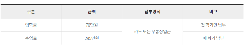 | 입학금 | 70만원 | 카드 또는 무통장입금 | 첫 학기만 납부 |