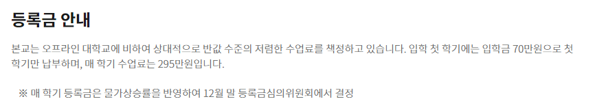 본교는 오프라인 대학교에 비하여 상대적으로 반값 수준의 저렴한 수업료를 책정하고 있습니다.