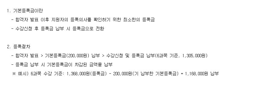 - 합격자 발표 > 기본등록금(200,000원) 납부 > 수강신청 및 등록금 납부(6과목 기준, 1,305,000원)