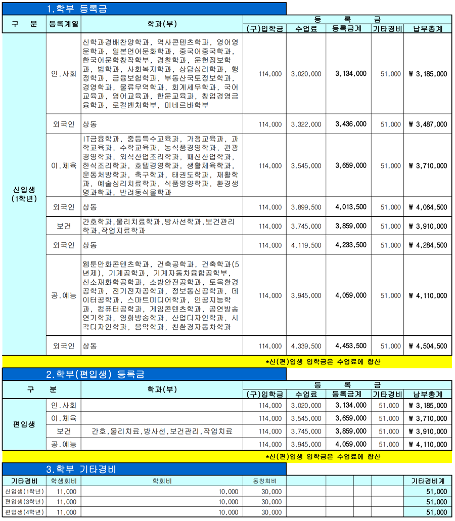 2024학년도 신(편)입학 등록금을 다음과 같이 안내드리오니 참고해주시기 바랍니다.