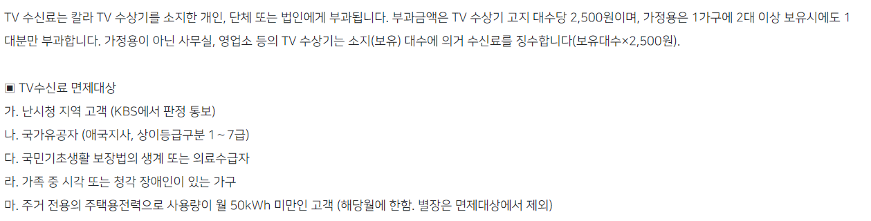 TV수신료는 방송법 제64조에 따라 KBS에서 칼라TV 소지한 개인, 단체 또는 법인을 기준으로 부과하며