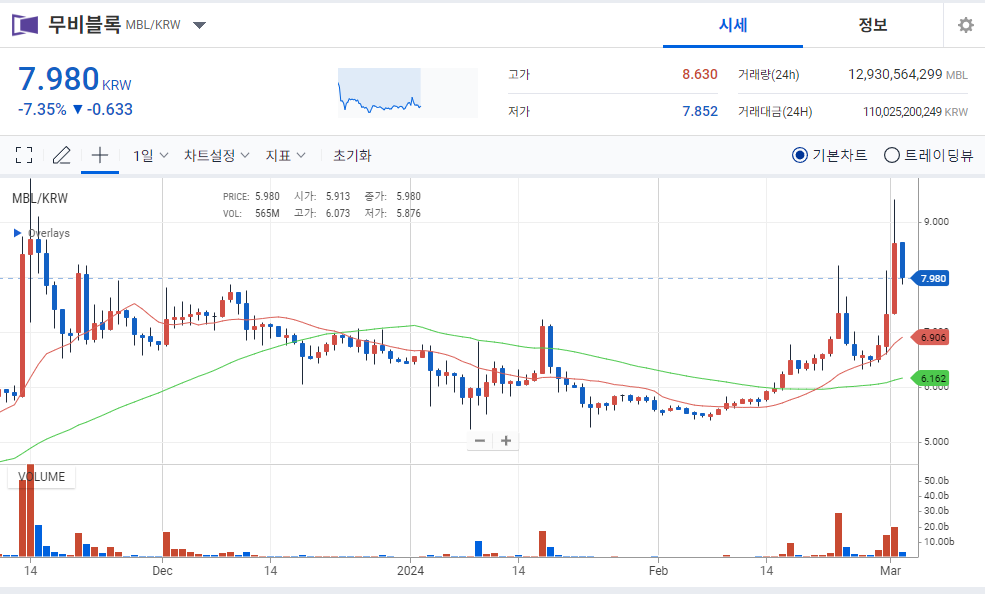 무비블록 코인 호재도 위와 같고 시세는 다음과 같습니다.