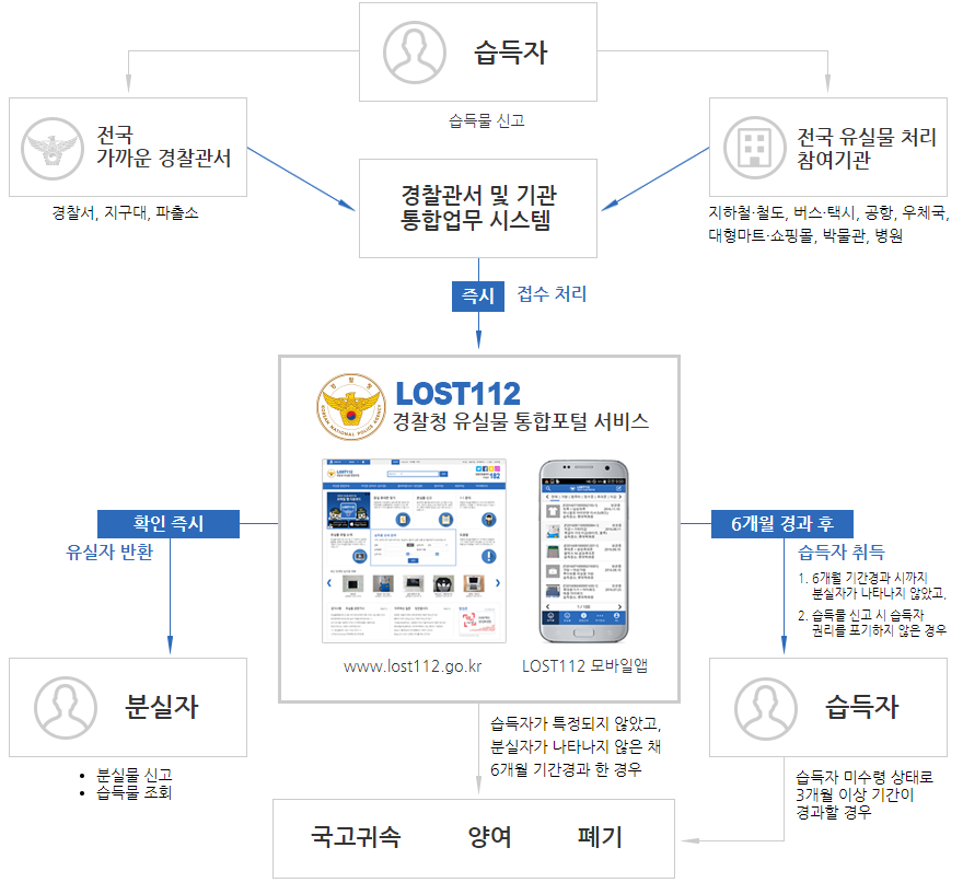 습득물 발생 시 유실물법 시행령에 따라 각 기관에서 7일 동안 보관(또는 즉시) 후 유실자가 나타나지 않을 경우 관할경찰서 또는 유실물센터(서울,부산)로 습득물이 이관되오니, 이점 참고하시길 부탁드립니다. 경찰청 유실물 통합포털에서는 국민들의 유실물을 최대한 빠르게 찾아드리기 위해 노력하겠습니다.