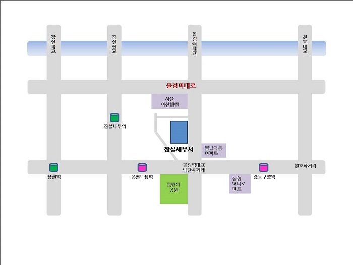 - 2호선 잠실나루역 1번 출구에서 아산병원 방향 도보 25분