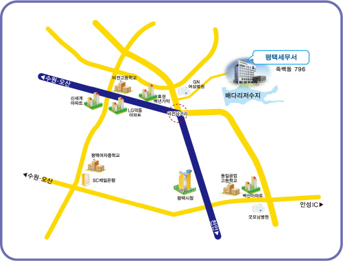 오시는 길평택 배다리 저수지 맞은편, 효성백년가약 아파트에서 도보 10분거리